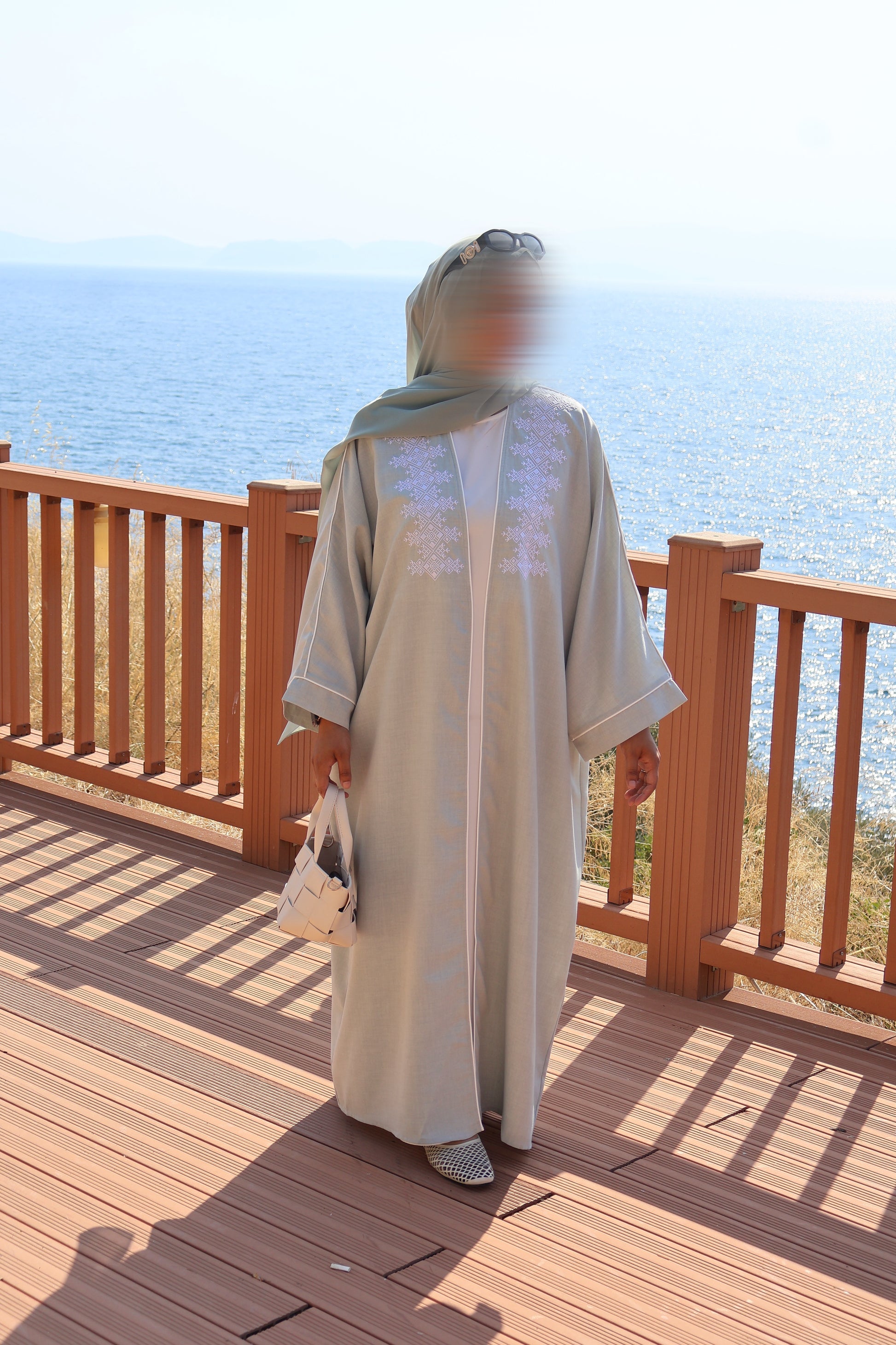 A timeless open abaya in a sage shade, finished with beautiful white embroidery on the chest. White piping runs down the front, arms, and sleeves for an elegant touch.