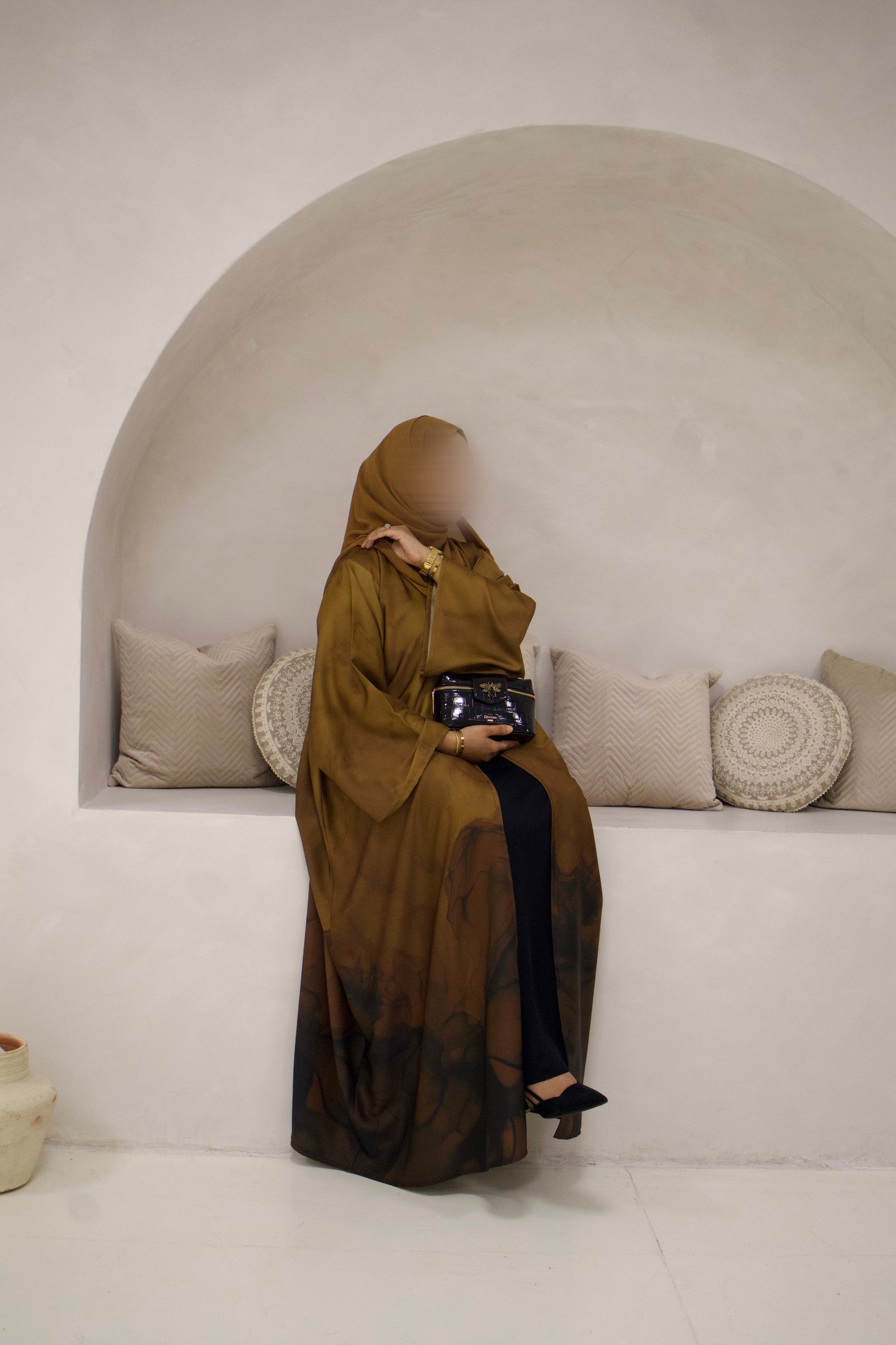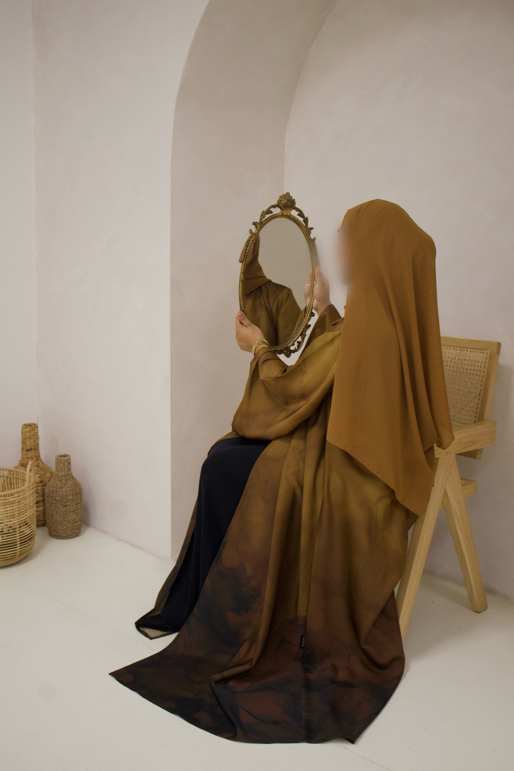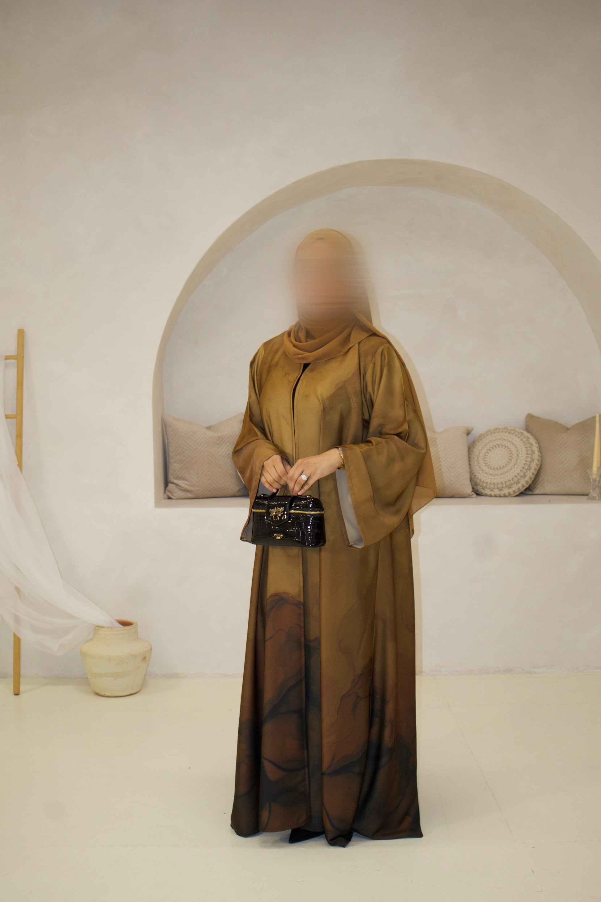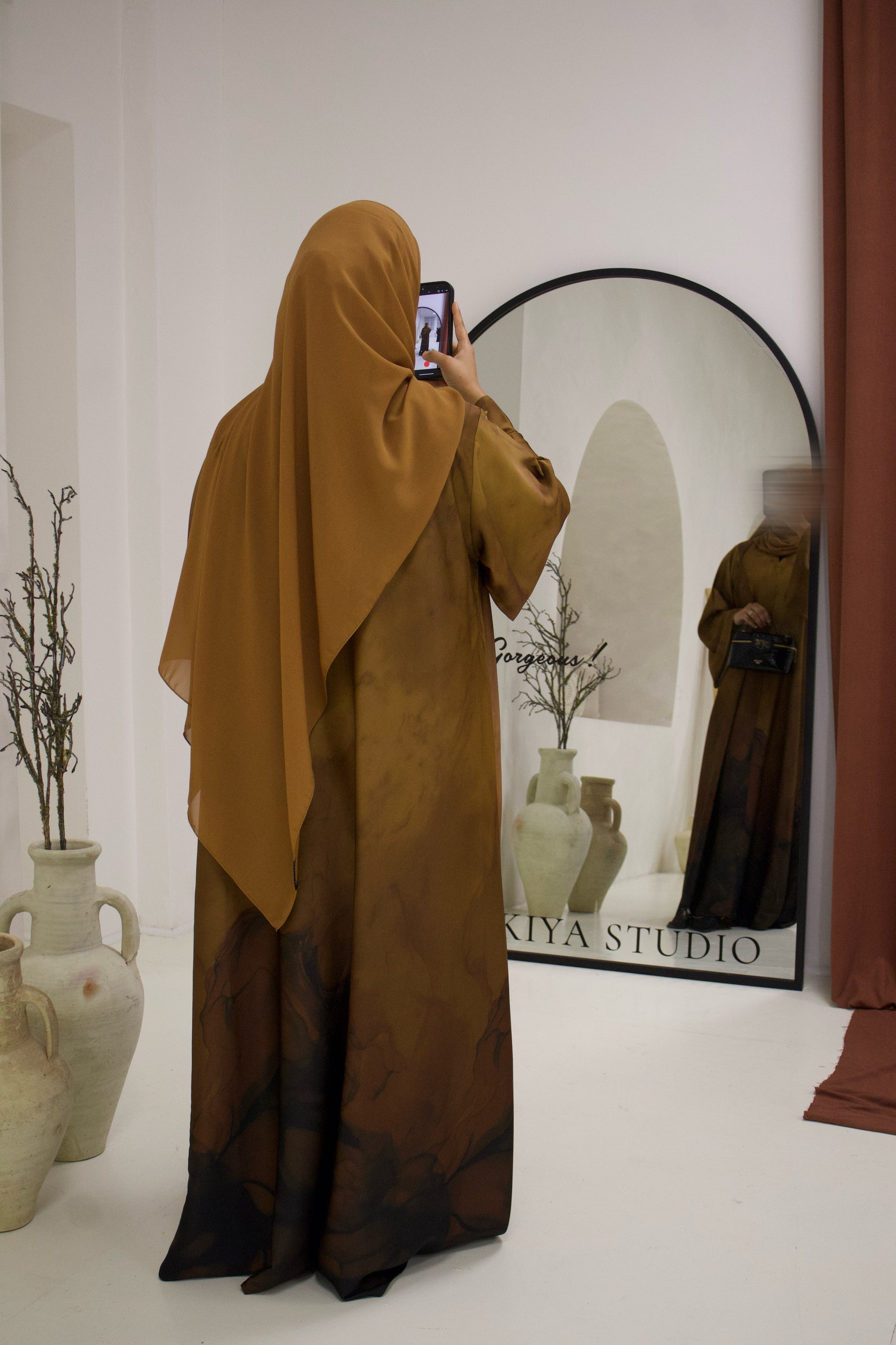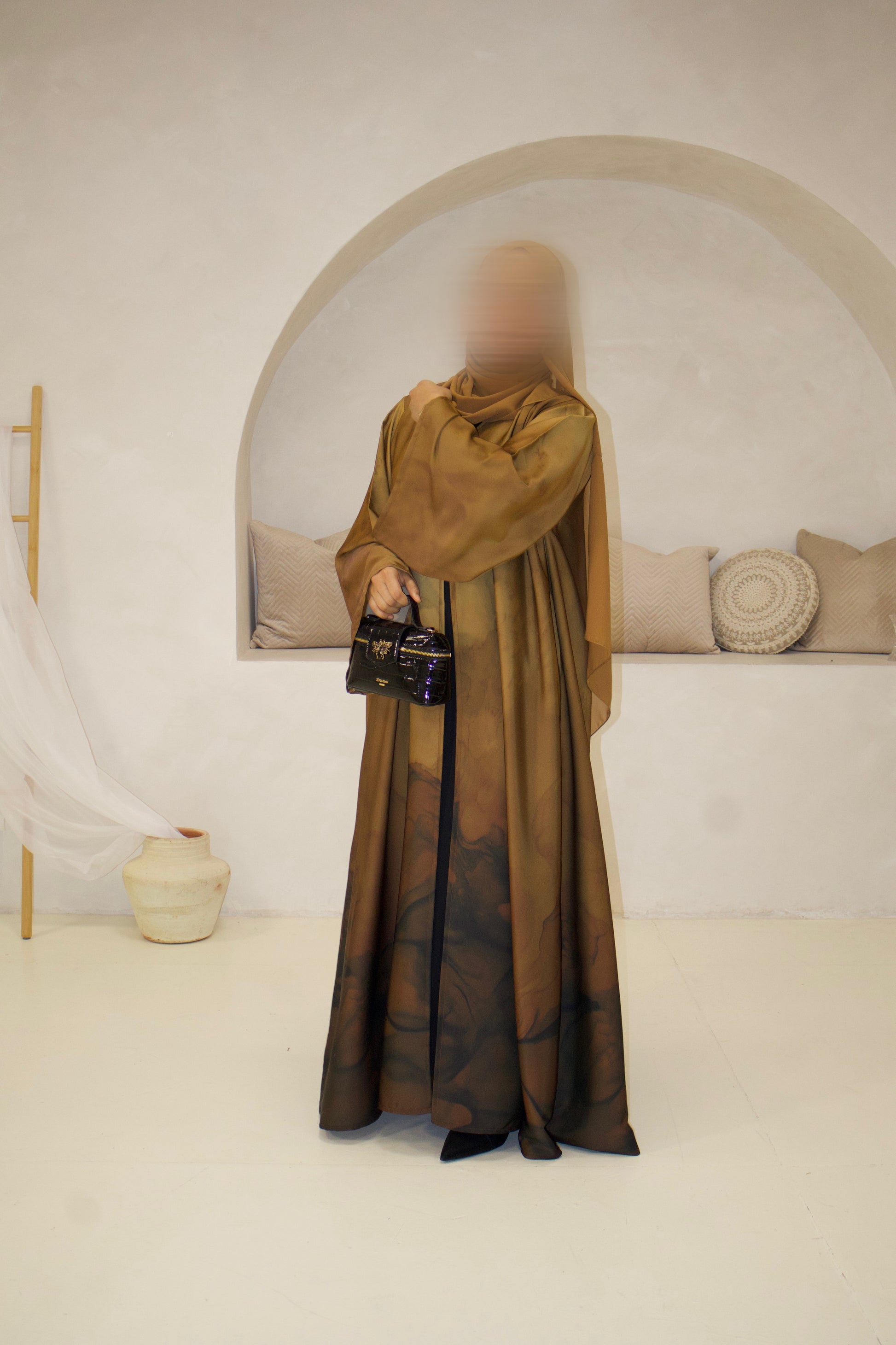 Burnt Sienna from our Marble Muse Collection, a beautifully designed A-line abaya that flows effortlessly with every movement. Featuring wide 12-inch sleeves and a top button detail that gives a modest closed look, this piece is crafted from a premium silky soft fabric that drapes elegantly. Designed for comfort and sophistication, it comes complete with a matching soft premium chiffon hijab, making it a timeless and graceful wardrobe essential.